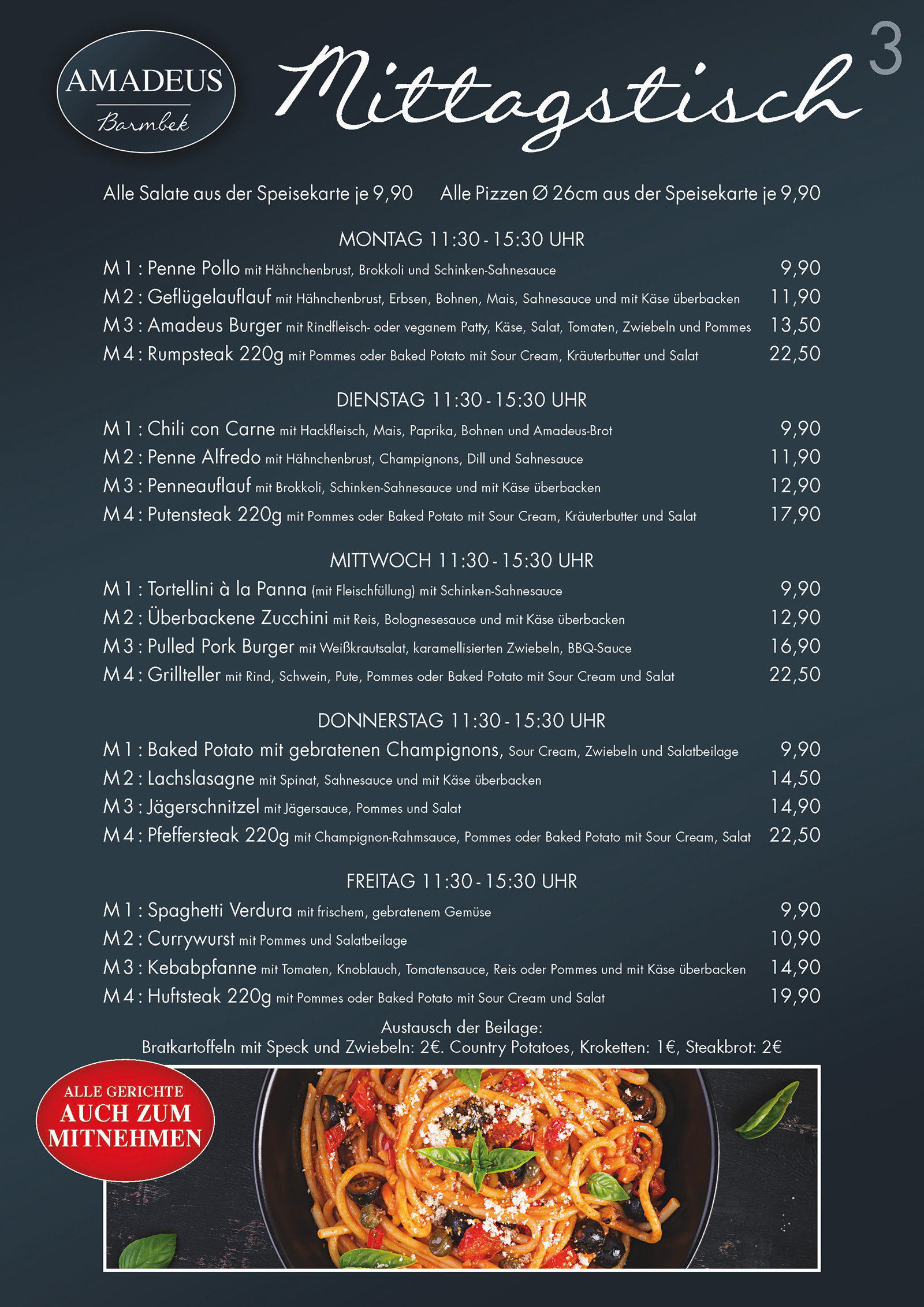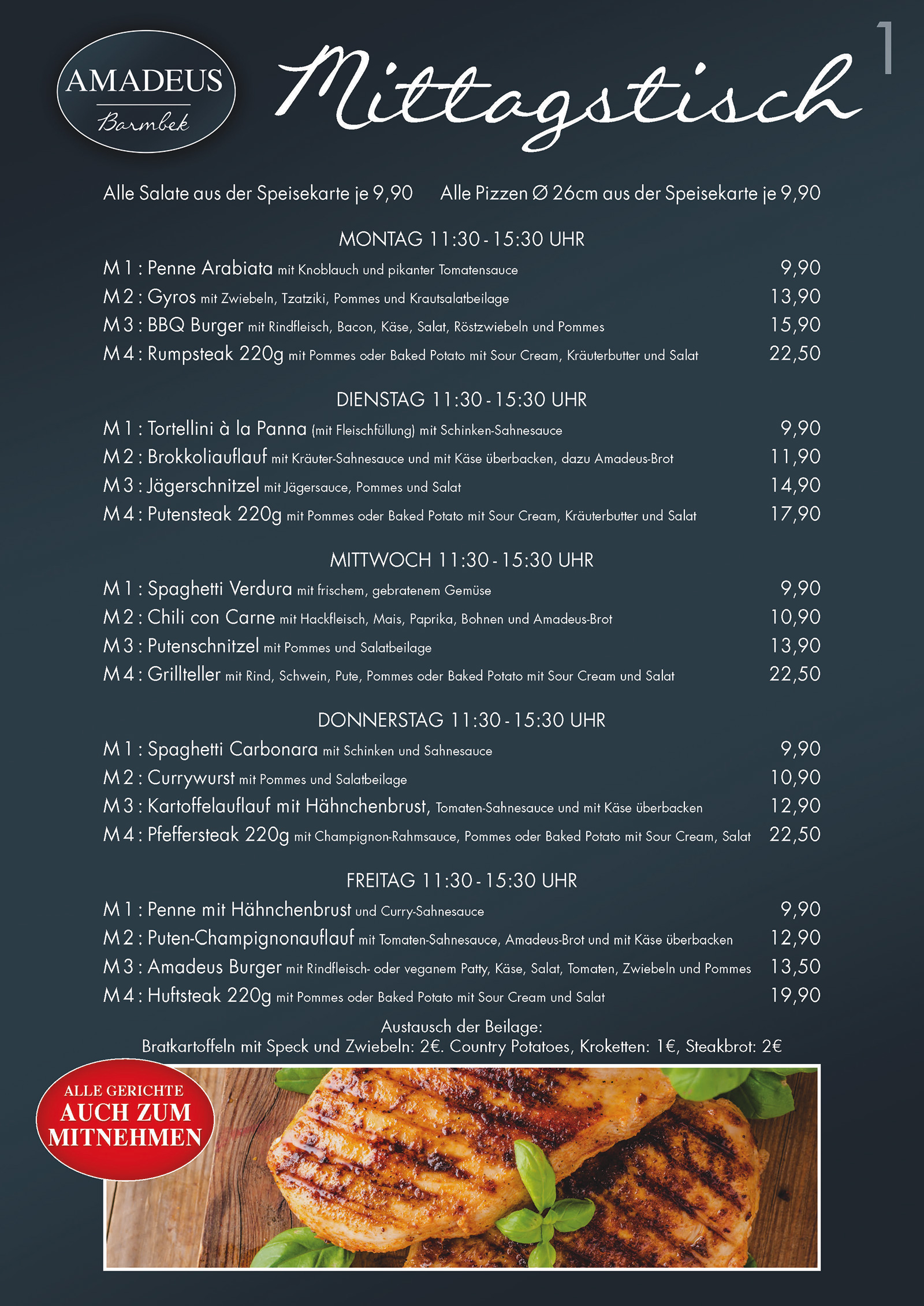 Extras: Bratkartoffeln mit Speck und Zwiebeln: 2€. Country Potatoes, Kroketten: 1€.